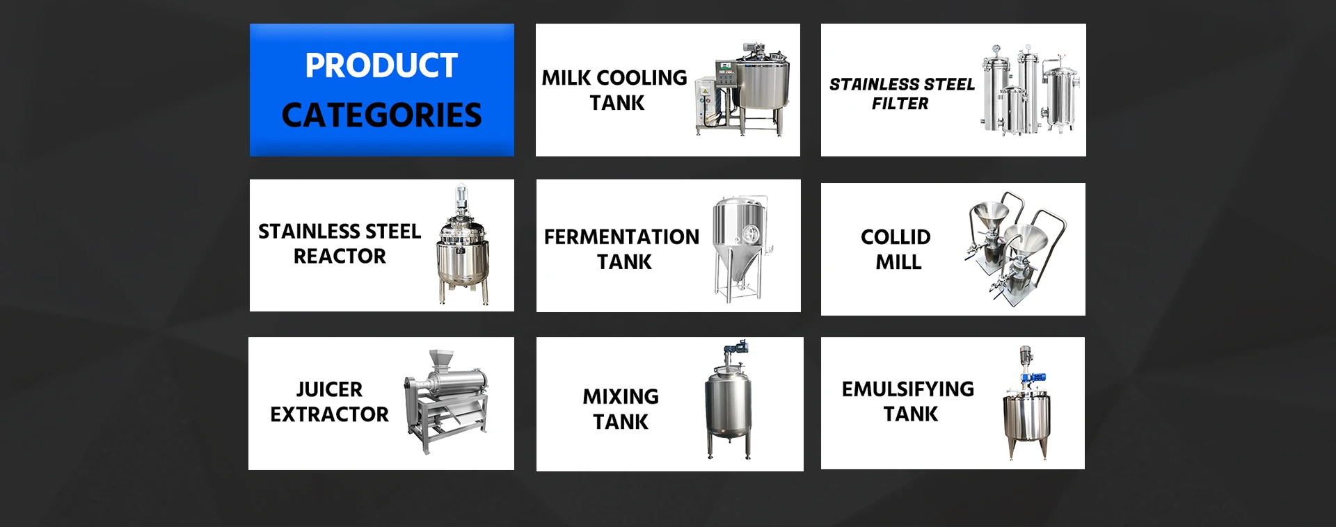 Productos principales:Tanque de acero inoxidable, equipo de extracción, hervidor de cocina, reactor de acero inoxidable, tanque de enfriamiento de leche